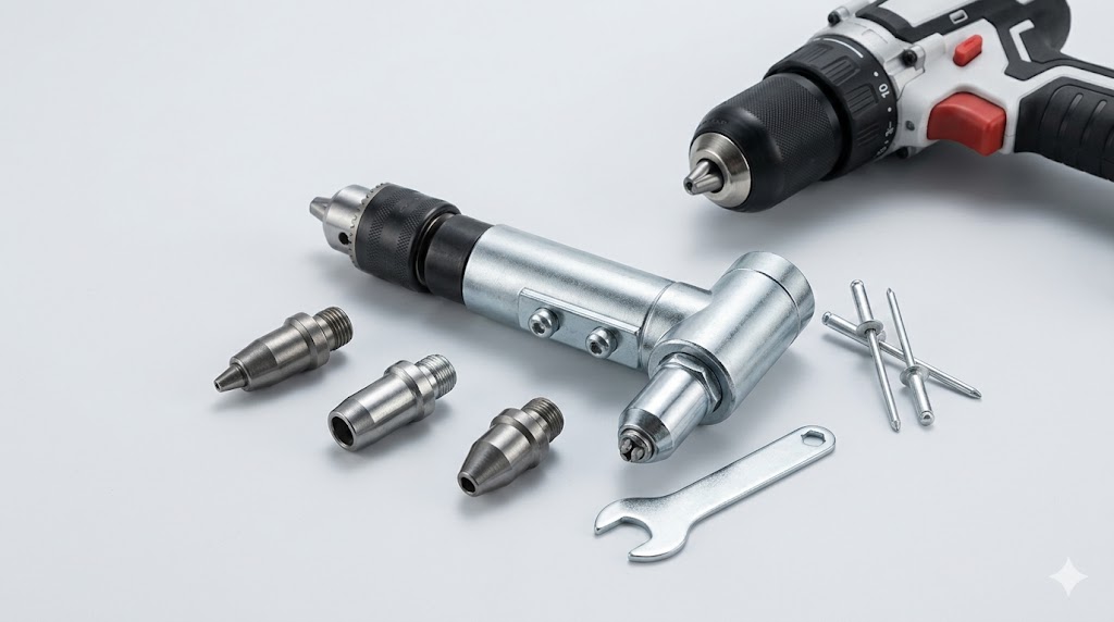 A versatile rivet gun adapter designed to convert your drill into a powerful riveting tool.